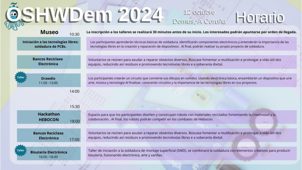 O sábado 12 de outubro, participaremos na Oshwdem 2024, dando unha charla sobre os Bancos de Reciclaxe Electrónico, en horario de 12.30 a 13.30 horas. E tamén contaremos cun stand durante a feira, onde axudaremos a quen queira reparar o seu ordenador ou recibir información sobre os bancos.
