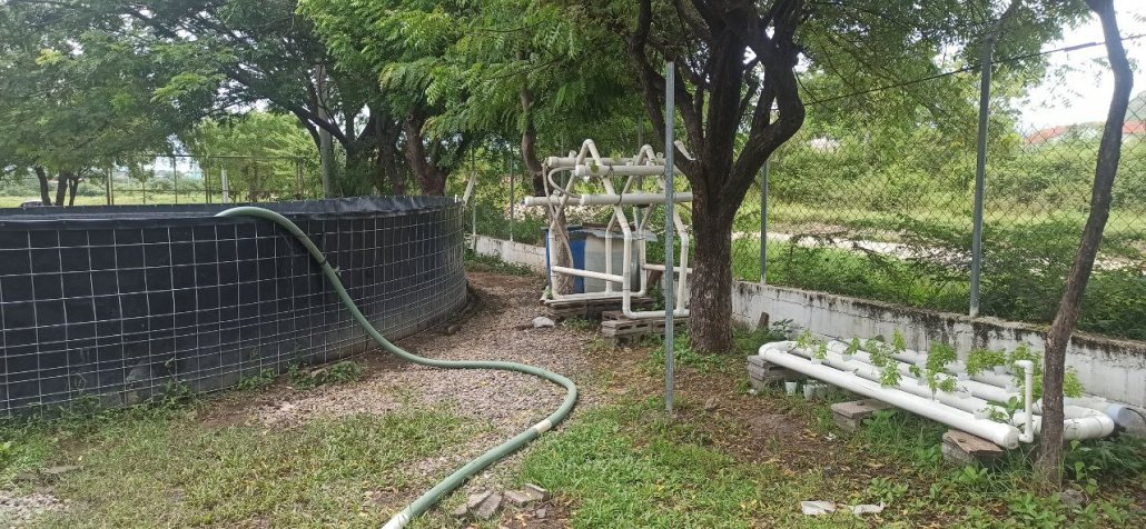Aproveitando a visita a esta facultade, tres estudantes de química mostráronnos unha serie de piscinas que tiñan con tilapias (un peixe de auga doce que se come) nas que fan estudos tanto da mortalidade desta especie como da profiferación de microalgas segundo as condicións eutróficas das augas, da clorofila, da salinidade, da temperatura, etc. e o sistema de filtrado que empregaban, o cal chamoume moito a atención. A auga dunha das piscinas con peixes era canalizada ata un bidón con pedras de río na que tiña que estar durante 24 horas. De aí mándase a outro bidón con tapóns de plástico de botellas que actúan de biofiltro, pois as bacterias adírense ás tapas e, 24 horas despois, esa auga métese nun circuíto de cultivo de plantas por hidroponía (só con auga, sen precisar de terra) e remata volvendo ao tanque de peixes. Este sistema recibe o nome de acuaponía.