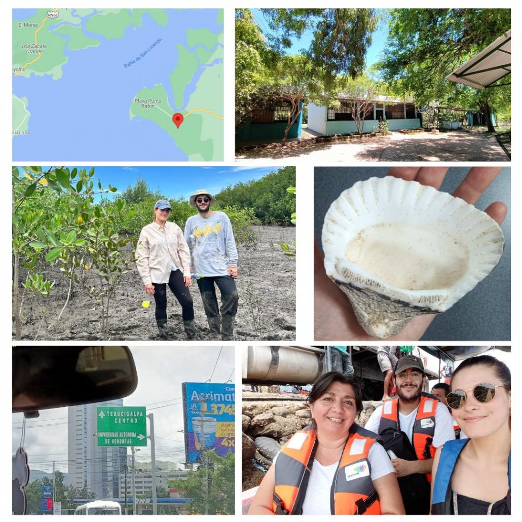 O procedemento era establecer varios cuadrantes de 5×5 en diversas zonas do manglar e o seu playón, e monitorear a lonxitude, o ancho, o peso e algunha medida máis dos moluscos comprendidos nel. Honduras non conta cunha talla mínima establecida para os moluscos bivalvos que comercializan (cascos de burro, ameixas, curiles…) polo que toman as medidas establecidas por El Salvador para poder establecer unha referencia similar. Unha vez recollidos os datos para o estudio, estes moluscos son devoltos o medio para que poidan seguir crecendo. O grupo de mulleres e homes mariscadoras é encantador, moi cercano e traballador, ensinándonos de cerca como é o seu traballo do día a día, a rutina, todas as anécdotas que teñen no manglar e os seus consellos para sobrelevar o calor e os zancudos. Tamén nos ensinaron como recollen os moluscos, se ningún tipo de ferramenta, unicamente cos seus pes descalzos no lodo.
