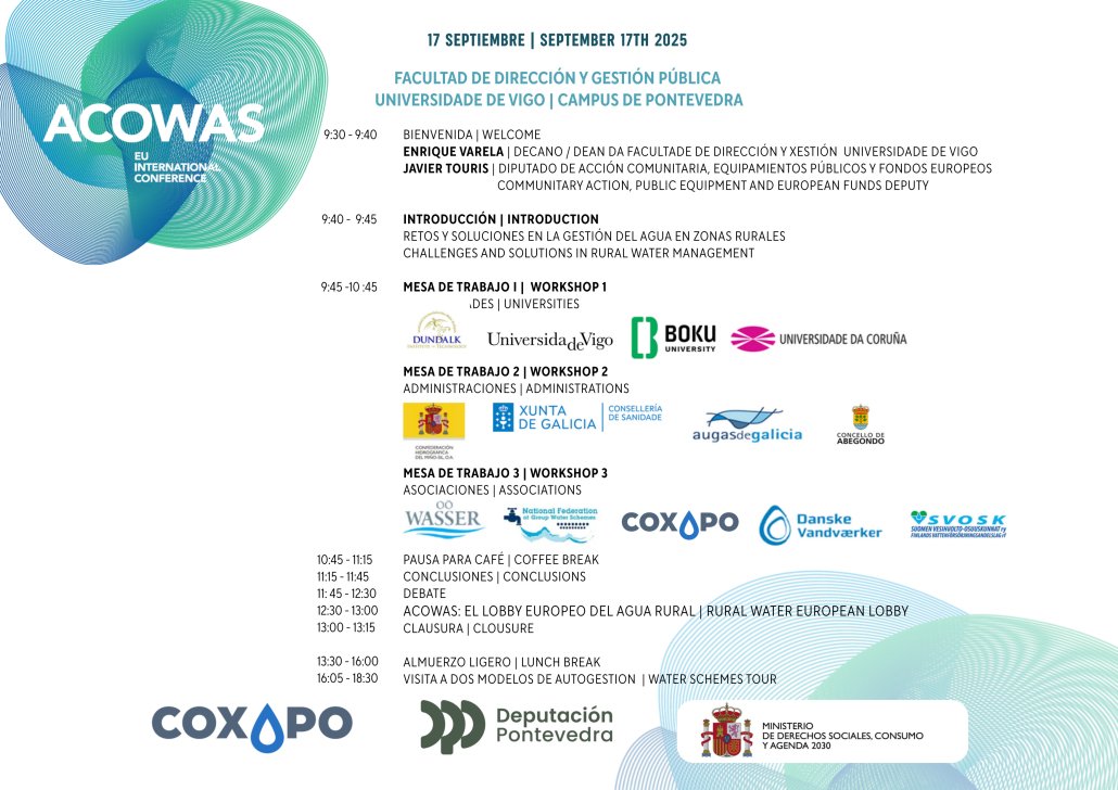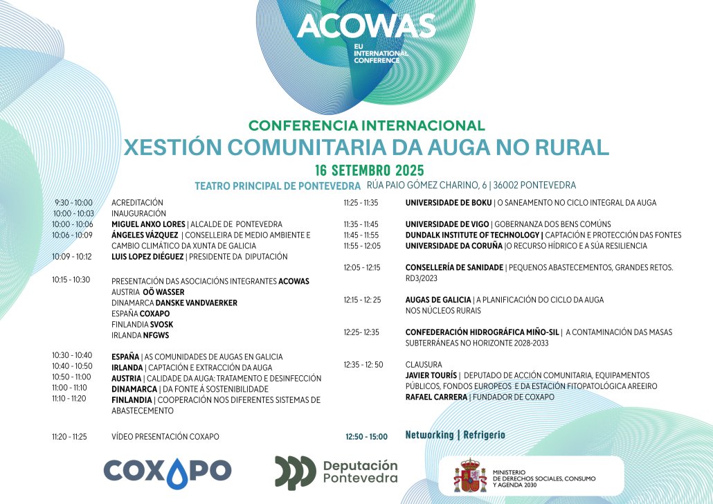 Otro objetivo era avanzar en la consolidación de una red europea de asociaciones de segundo nivel agrupando a su vez asociaciones vecinales. ACOWAS aprovechó entonces este encuentro para formalizar estructura, contando con socias en Galicia, Irlanda, Dinamarca, Finlandia y Austria. Quieren defender esa forma de gestión vecinal, con participación comunitaria y co-responsabilidad de vecinas y vecinos en el cuidado del recurso hídrico y, cada vez más, de los entornos clave a nivel ambiental (como zonas de recarga).