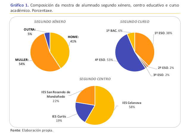 Finalmente, a enquisa baséase en 125 cuestionarios válidos (54% mulleres). A distribución por centro é dun 58% do IES de Celanova, 22% do IES San Rosendo de Mondoñedo e 19% do IES de Curtis3.