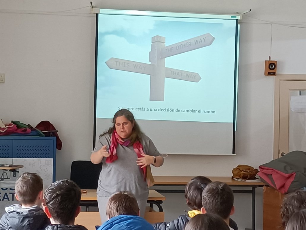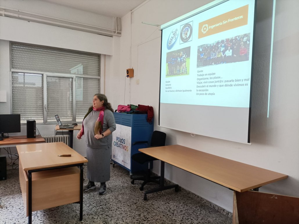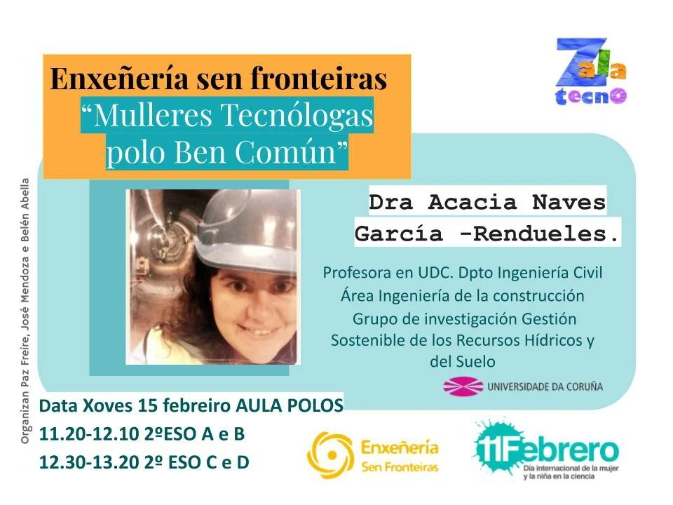 Acacia Naves García-Rendueles, voluntaria de ESF dende hai moitos anos (actualmente no grupo de Mulleres Tecnólogas para o Ben Común e asesora técnica en temas de auga), doctora Enxeñería de Camiños e profesora na UDC, estivo no IES Zalaeta, falando para 4 grupos de 2º da ESO (houbo que facer dúas tandas). O título do faladoiro foi “Cómo atopei o que realmente me gusta” . Estivo acompañada tamén polas docentes Paz, José, Belén, Luisa, MªXosé e Iria.