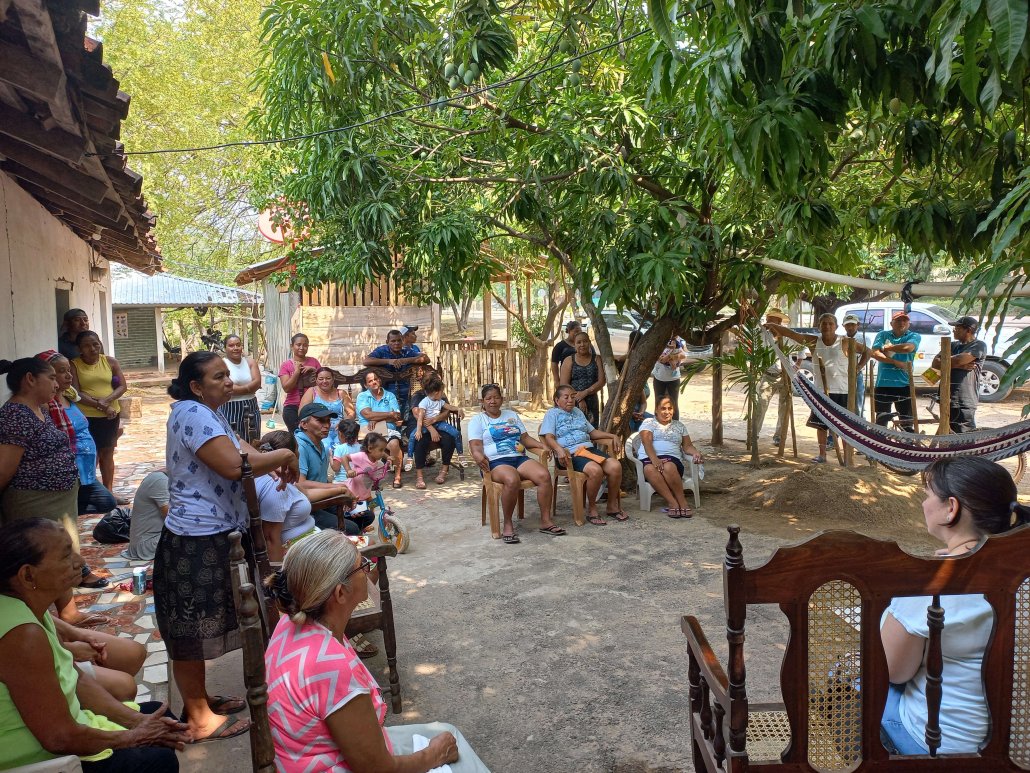 Esta reunión de identificación tuvo lugar el 2 de Mayo de 2023, en el patio de la vivienda de una de las familias de la comunidad de Tres Piedras. Participaron activamente miembros de la Junta de Agua, mayormente mujeres, de la Patronal (junta vecinal), de la alcaldía (alcalde, ingeniero de la municipalidad, etc…), otros miembros de la comunidad, Wendy (directora técnica de NASMAR), Raquel y Sandra (técnicas de ISF en Honduras).
