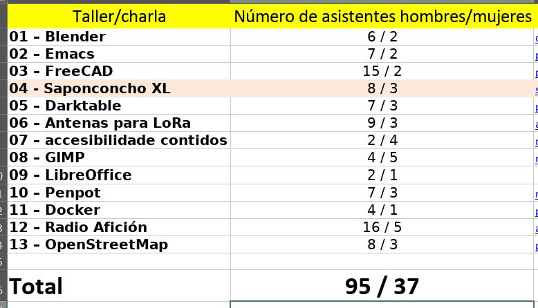 Na táboa seguinte vese as persoas asistentes a cada obradoiro, 132 en total (aínda que moitas repetiron varias veces). Chama a atención como o máis demandado foi o de Radio Afición (que ten bastante comunidade en Galicia, e seguro que o Apagón tamén algo influiu…). Tamén o de FreeCAD tivo case cheo.
