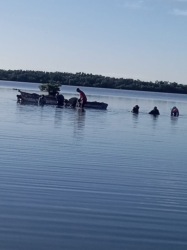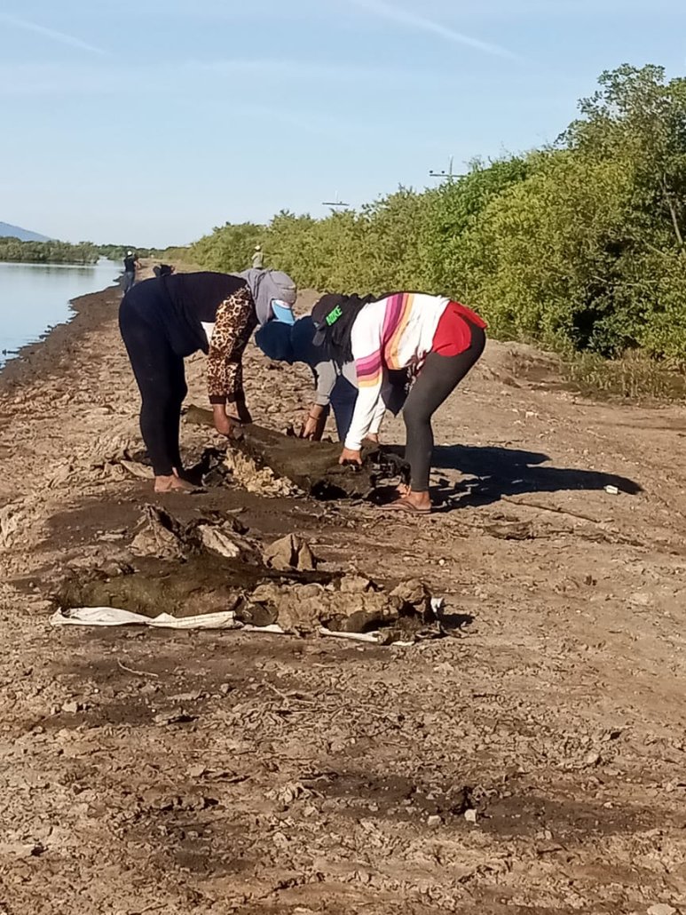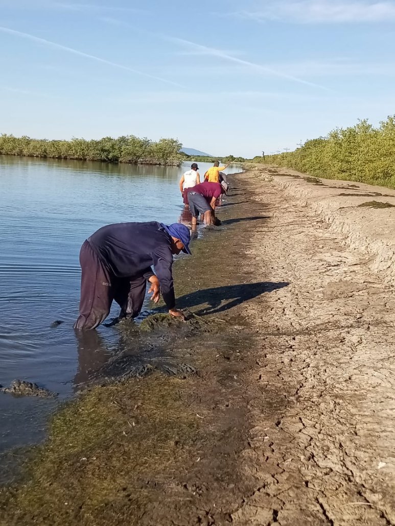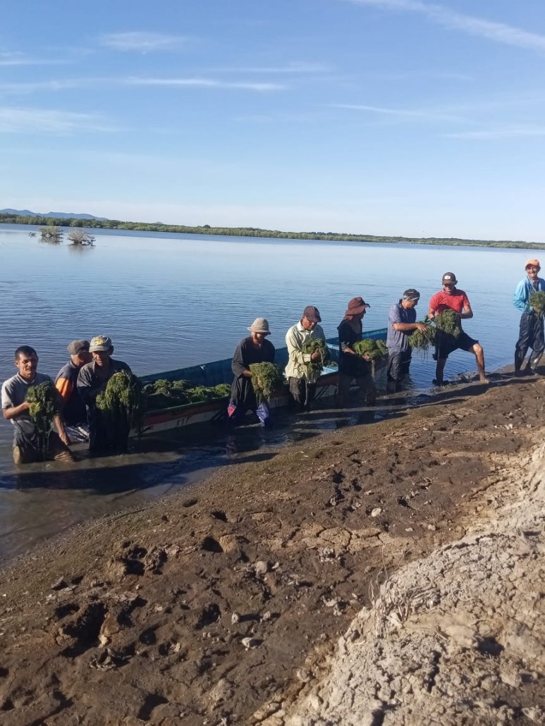En el proyecto PR803D 2022-52, financiado por Xunta de Galicia, se ha comenzado a estudiar la biología y comportamiento de esta planta por parte de CODDEFFAGOLF, nuestra asociación aliada directa en Honduras para la ejecución del proyecto, en alianza con la delegación regional de la UNAH (Universidad Nacional Autónoma de Honduras). Con aguas todavía en la laguna, pero ya comenzando a bajar dado que ya terminó la época de lluvias, esta vegetación todavía se mantiene activa, pero en breve se secará completamente, dejando sus nudos de propagación en la arena. Antes de ello, se ha decidido hacer una retirada general de la planta para medir el volumen que se ha producido en la temporada de lluvias de este año y que en cierta medida se contribuya a controlar su propagación para la próxima temporada. Por ello, pescadoras y pescadores que utilizan la laguna están retirando de forma controlada y con medios manuales el zacate acumulado en un área definida de la laguna. El análisis de lo extraído y vigilar el comportamiento posterior de la planta, será determinante para conocer más sobre el equilibrio de la laguna y decidir actuaciones en siguientes fases del programa.