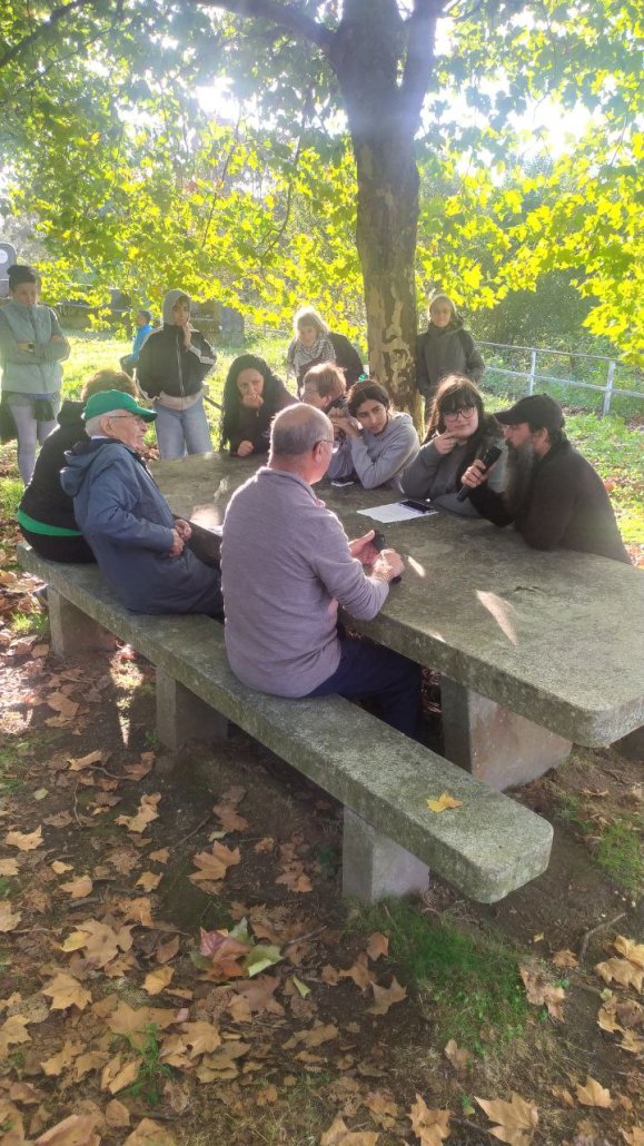Finalmente, leváronnos a ver os Petroglifo do Sobral e o Mirador do Viso, onde unhas nenas da comunidade de montes lles fixeron unha serie de preguntas a persoas comuneiras máis “veteranas”, por exemplo como era o colexio na súa época, como se divertían, como ligaban… Estivo moi simpático. E por últimos, a ritmo de charanga na casa veciñal 🙂