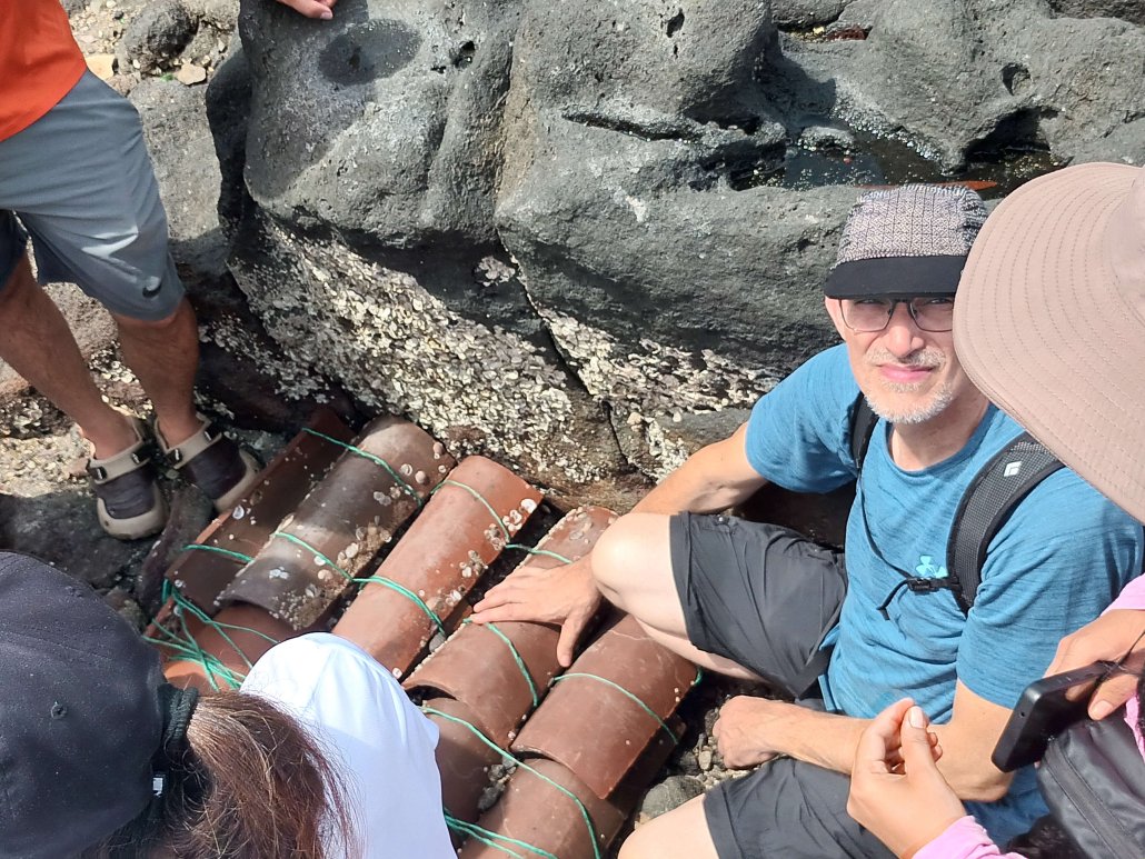 Se visitaron puntos de captura de semilla con teja, en zona arenosa y de piedra, y puntos de recogida de semilla en manglar con fango, mediante sacos colgados de cuerda. Estos últimos fue un poco de aventura caminando en el manglar por una ruta muy singular en la que pudimos encontrarnos con sorpresas, como el escorpión de mar, anélidos “sipuncúlidos” (que fue la palabra aprendida del día gracias a la identificación por José Manuel) y otras especies.
